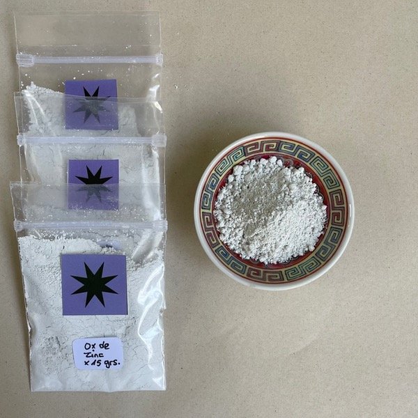 Óxido cerámico de zinc x 15gr, es de color blanco y puede utilizarse como fundente y modificador de esmaltes. También para: